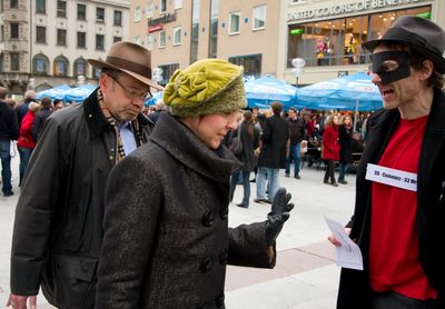"Grüß Gott, ich bin von der Commerzbank und brauche dringend Ihr Geld!" Mit diesen und ähnlichen Worten begrüßten als Bankmanager kostümierte Panzerknacker die Passanten auf dem Münchner Marienplatz. Natürlich zeigten sich die überraschten Passanten unwillig: "Nix da!", "Bin selber pleite!" oder "Nein, danke". Sie hatten auch wenig Verständnis für die Argumentation der Banker: "Wir haben aber viel mehr Schulden als Sie!" oder für deren aufrichtige Entschuldigung: "Wir haben uns halt verzockt".