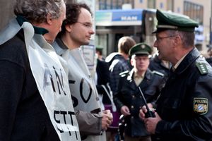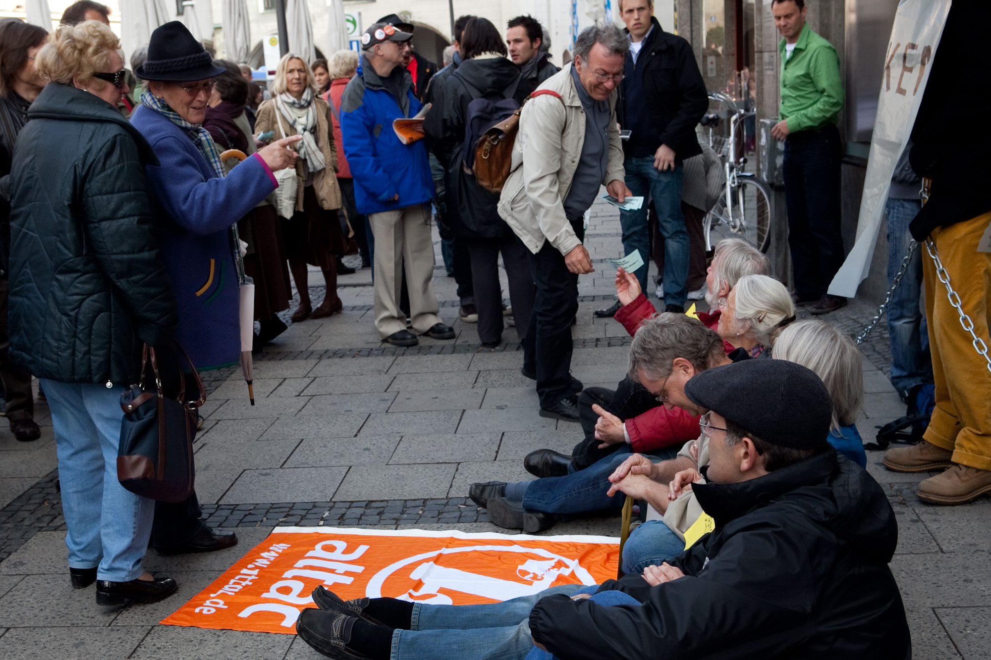 Mit einer nachdrücklichen Aktion vor der Filiale der Deutschen Bank am Marienplatz haben Münchner Aktivistinnen und Aktivisten des globalisierungskritischen Netzwerkes Attac am Mittwoch gegen das Sparpaket der Bundesregierung und für eine strenge Regulierung von Banken demonstriert. Drei Attac-Mitglieder ketteten sich um 15:30 Uhr vor dem Eingang der Filiale an und blockierten so den Zugang. Zu ihren Füßen verstärkten fünf weitere Aktivisten die Sperrung durch eine Sitzblockade. Die Demonstranten riefen Parolen wie "Ein-Euro-Job für Ackermann - Boni für den kleinen Mann!". Sie wurden durch einen Auftritt des Münchner Attac-Chors und eine satirische Performance unterstützt und zogen zahlreiche Schaulustige und Oktoberfest-Touristen an, von denen sich viele spontan mit der Aktion solidarisierten. Der Polizei gelang es erst nach 30 Minuten, die Kette zu durchtrennen, worauf Attac München die Aktion beendete.
